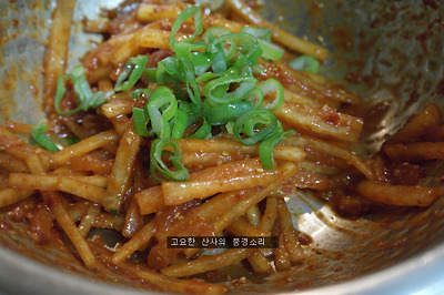 ㉢ 양념을 무쳐준 후 부추, 깨소금을 넣고 무쳐주면 완성된다.