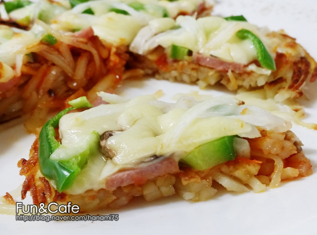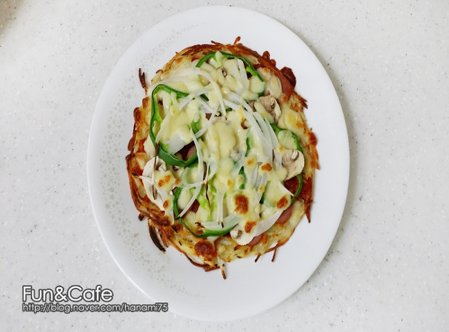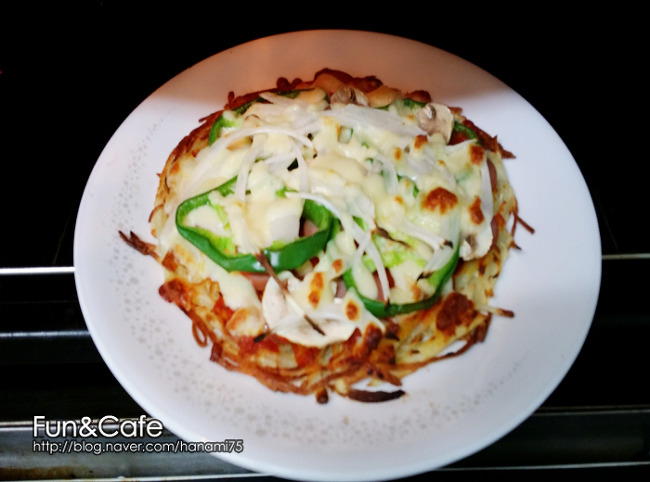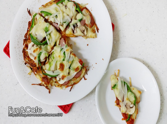 살짝 빈대떡 같아 보이긴 하지만 그래도 나름대로 피자~~ㅋㅋ 감자채 피자 완성이에영~