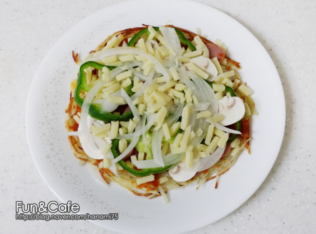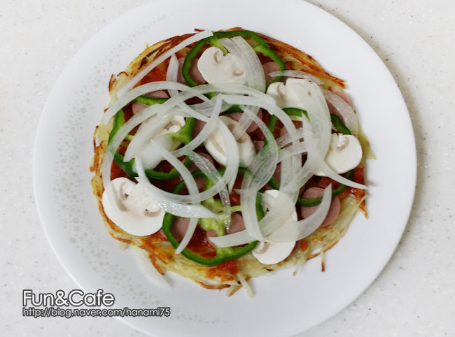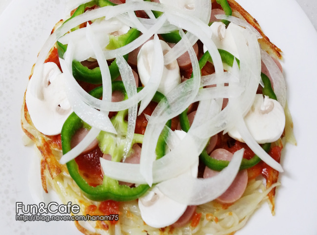 감자, 소세지, 피망, 양파, 양송이버섯, 스파게티소스, 모짜렐라치즈