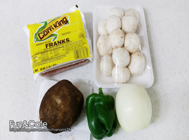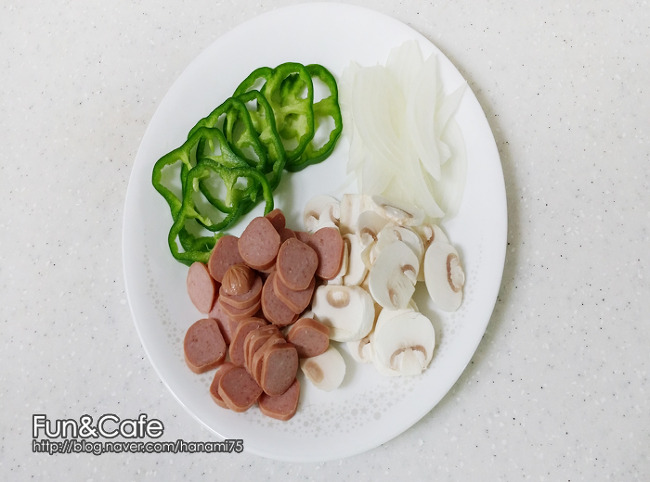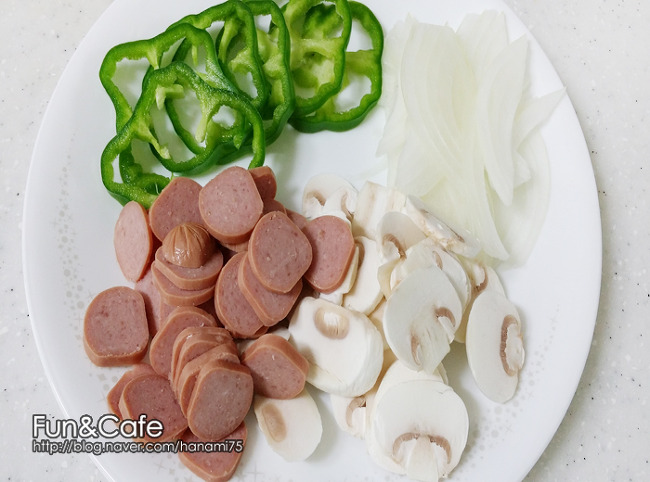 소세지, 피망, 양파, 양송이도 얇게 썰어 준비해주세여~