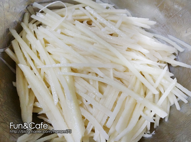 제일 먼저 감자는 채를 썰어 소금을 살짝 뿌린 뒤 5분 정도 절여주세여~