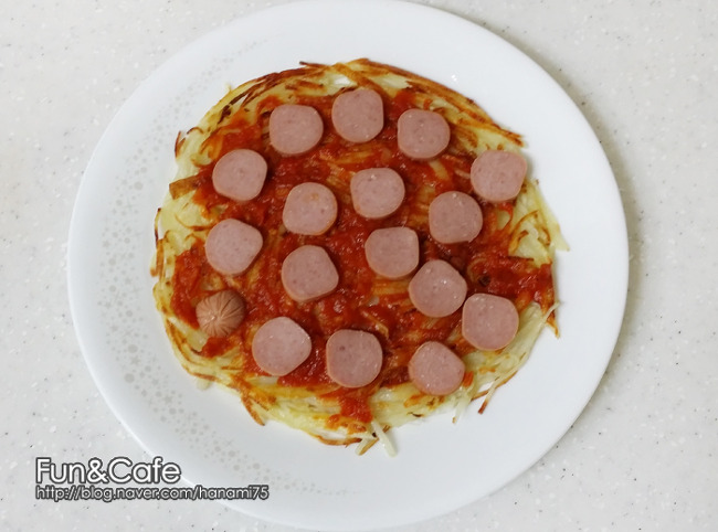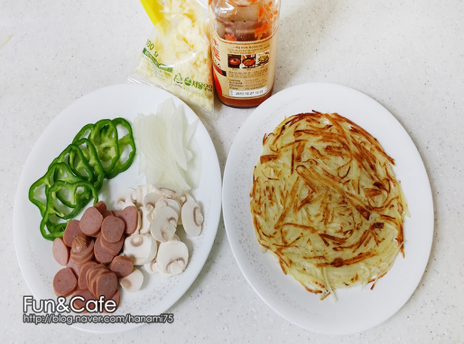 구워진 감자채와 소세지와 채소, 모짜렐라치즈, 스파게티소스를 준비해 주세여~