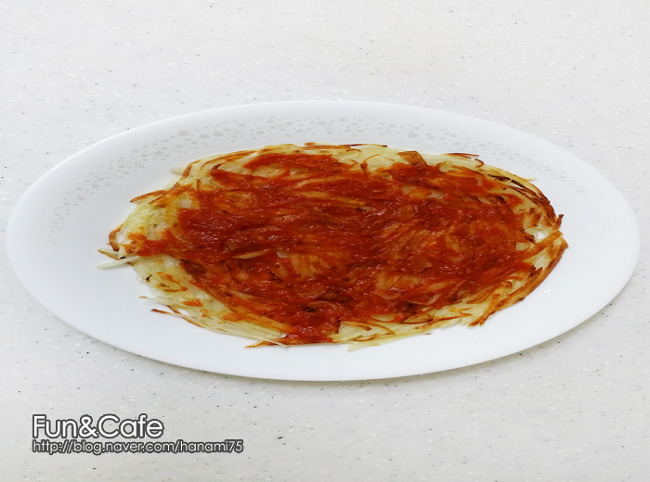 감자채 위에 스파게티소스를 골고루 발라주세여~