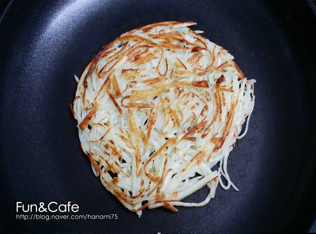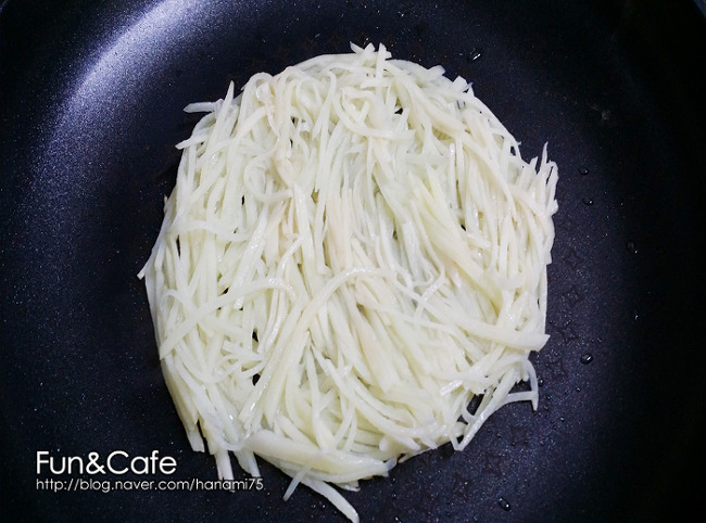달궈진 팬에 기름을 두르고 감자채를 둥글게 만들어 눌러 주시면서 부쳐 주세여~