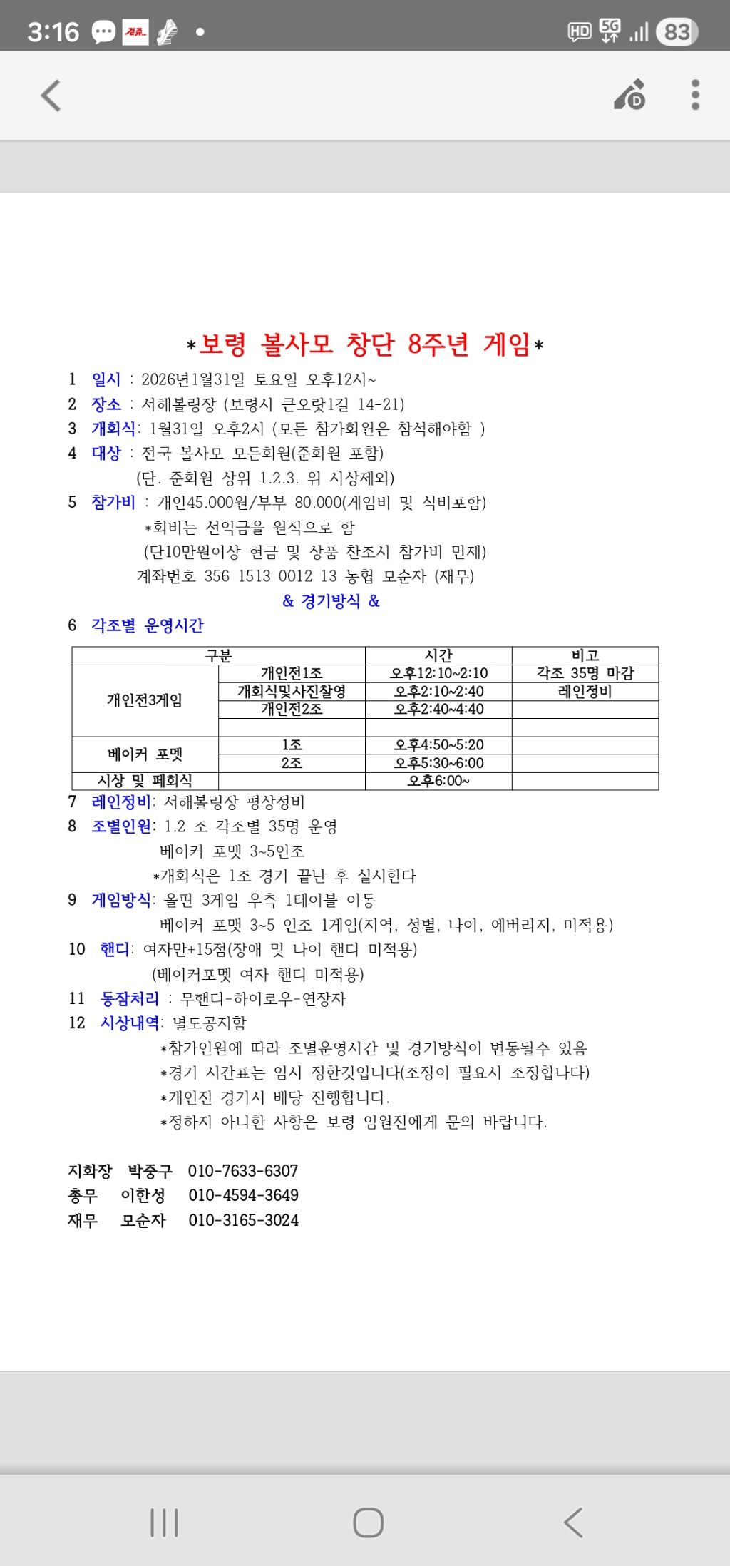 보령볼사모8주년 창단행사 경기개요 작성자보령♡박중구(핸섬)|작성시간26.01.05|조회수486 목록 댓글 4 글자크기 작게가 글자크기 크게가 다음검색 현재 게시글 추가 기능 열기 북마크 공유하기 신고 센터로 신고 댓글 댓글 4 댓글쓰기 답글쓰기 댓글 리스트 작성자조부한 | 작성시간 26.01.05 전국 볼사모 회원님들 많읁참석 바랍니다 화이팅 작성자보령♡모순자 | 작성시간 26.01.05 1부 참석요 작성자조부한 | 작성시간 26.01.05 저도1부참석 작성자박순경보령♡55여자150 | 작성시간 26.01.06 1부참석요 댓글 전체보기