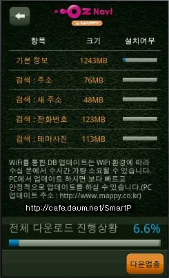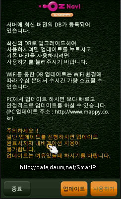 오즈 나비 (oz navi) 를 설치하신후 실행을 하시면 아래와 같이 나오는데요 WIFI에서 업데이트가 되며 맵피 http://www.,mappy.co.kr 에서도 업데이트가 가능하다는 내용이네요. (3G에서는 업데이트가 않되요~) 이것저것 다 모르겠다 하시는분들은 가까운 LG U+에 가셔도 되실꺼에요 요즘 직영이나 대리점엔 wifi가 다 있으니까용~