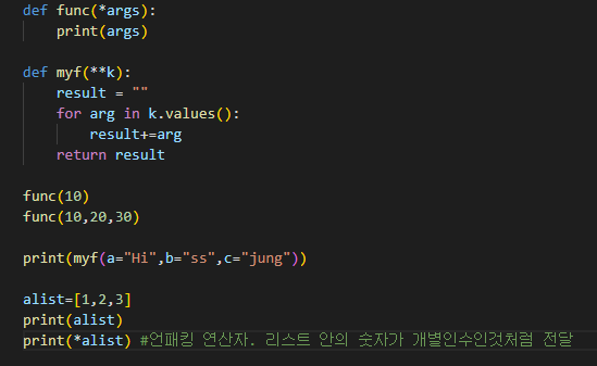 *args 와 같은 *매개변수를 사용--> 가변 길이 인수를 함수에 전달 가능 ,but 키워드 인수는 전달 불가
