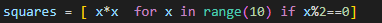 squares = [ x*x for x in range(10) if x%2==0]