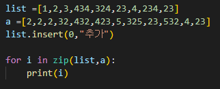 zip()함수는 2개의 리스트를 받아서 항목 두개를 묶어서 제공