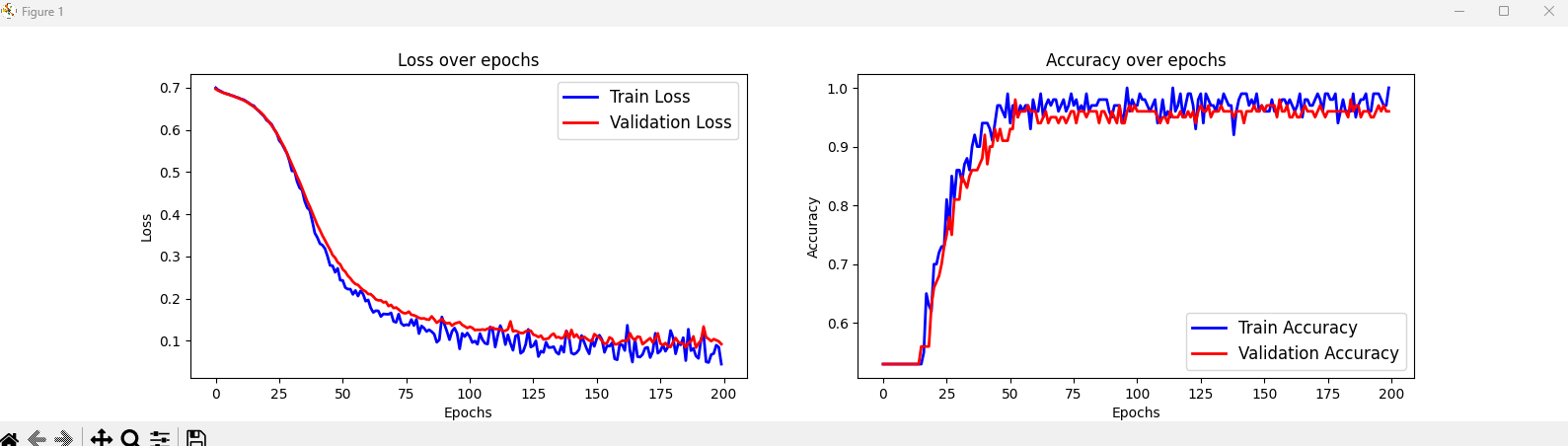 1 2 3 4 5 6 7 8 9 10 11 12 13 14 15 16 17 18 19 20 21 22 23 24 25 26 27 28 29 30 31 32 33 34 35 36 37 38 39 40 41 42 43 44 45 46 47 48 49 50 51 52 53 54 55 56 57 58 59 60 61 62 63 64 65 66 67 68 69 70 71 72 73 74 75 76 77 78 79 80 81 82 83 84 85 86 87 88 89 90 91 92 93 94 95 96 97 98 99 100 101 102 103 104 105 106 107 108 109 110 111 112 113 114 115 116 117 118 119 120 121 122 123 124 125 126 127 128 129 130 131 | from torch.utils.data import DataLoader,TensorDataset from mlxtend.plotting import plot_decision_regions import torchvision.transforms as transforms import numpy as np import torch.nn as nn import matplotlib.pyplot as plt import torch np.random.seed(1) torch.manual_seed(1) x = np.random.uniform(low=-1, high=1, size=(200, 2)) y = np.ones(len(x)) y[x[:, 0] * x[:, 1]<0] = 0 n_train = 100 x_train = torch.tensor(x[:n_train, :], dtype=torch.float32) y_train = torch.tensor(y[:n_train], dtype=torch.float32) x_valid = torch.tensor(x[n_train:, :], dtype=torch.float32) y_valid = torch.tensor(y[n_train:], dtype=torch.float32) train_ds = TensorDataset(x_train, y_train) batch_size = 2 torch.manual_seed(1) train_dl = DataLoader(train_ds, batch_size, shuffle=True) # nn.Module 클래스 상속 class NoisyLinear(nn.Module): def __init__(self, input_size, output_size, noise_stddev=0.1): # 생성자에 새로운 매개변수 만들거나 초기화 가능 super().__init__() w = torch.Tensor(input_size, output_size) self.w = nn.Parameter(w) nn.init.xavier_uniform_(self.w) b = torch.Tensor(output_size).fill_(0) self.b = nn.Parameter(b) self.noise_stddev = noise_stddev def forward(self, x, training=False): # training=False -> 층이 훈련에 사용되는지 구분하는 역할 if training: noise = torch.normal(0.0, self.noise_stddev, x.shape) x_new = torch.add(x, noise) else: x_new = x return torch.add(torch.mm(x_new, self.w), self.b) class MyNoistModule(nn.Module): def __init__(self): super().__init__() self.l1 = NoisyLinear(2, 4, 0.07) self.a1 = nn.ReLU() self.l2 = nn.Linear(4, 4) self.a2 = nn.ReLU() self.l3 = nn.Linear(4, 1) self.a3 = nn.Sigmoid() def forward(self, x, training=False): x = self.l1(x, training) x = self.a1(x) x = self.l2(x) x = self.a2(x) x = self.l3(x) x = self.a3(x) return x def predict(self, x): x = torch.tensor(x, dtype=torch.float32) pred = self.forward(x)[:, 0] return (pred>=0.5).float() # 예측 클래스 0 or 1 반환 torch.manual_seed(1) model = MyNoistModule() loss_fn = nn.BCELoss() optimizer = torch.optim.SGD(model.parameters(), lr=0.015) torch.manual_seed(1) num_epochs=200 loss_hist_train = [0] * num_epochs accuracy_hist_train = [0] * num_epochs loss_hist_valid = [0] * num_epochs accuracy_hist_valid = [0] * num_epochs plt.ion() fig,(ax1,ax2)=plt.subplots(1,2,figsize=(16,4)) for epoch in range(num_epochs): for x_batch, y_batch in train_dl: pred = model(x_batch, True)[:, 0] loss = loss_fn(pred, y_batch) loss.backward() optimizer.step() optimizer.zero_grad() loss_hist_train[epoch] += loss.item() is_correct = ( (pred>=0.5).float() == y_batch ).float() accuracy_hist_train[epoch] += is_correct.mean() # 훈련 손실 및 정확도 평균 계산 loss_hist_train[epoch] /= n_train/batch_size accuracy_hist_train[epoch] /= n_train/batch_size # 검증 pred = model(x_valid)[:, 0] loss = loss_fn(pred, y_valid) loss_hist_valid[epoch] = loss.item() is_correct = ((pred>=0.5).float() == y_valid).float() accuracy_hist_valid[epoch] += is_correct.mean() # 실시간 그래프 업데이트 ax1.clear() ax1.plot(loss_hist_train, lw=2, label="Train Loss", color='blue') ax1.plot(loss_hist_valid, lw=2, label="Validation Loss", color='red') ax1.legend(fontsize=12) ax1.set_xlabel('Epochs') ax1.set_ylabel('Loss') ax1.set_title('Loss over epochs') ax2.clear() ax2.plot(accuracy_hist_train, lw=2, label="Train Accuracy", color='blue') ax2.plot(accuracy_hist_valid, lw=2, label="Validation Accuracy", color='red') ax2.legend(fontsize=12) ax2.set_xlabel('Epochs') ax2.set_ylabel('Accuracy') ax2.set_title('Accuracy over epochs') plt.pause(0.01) # 그래프 갱신 후 잠시 멈춤 plt.ioff() # 인터랙티브 모드 종료 plt.show() | cs |