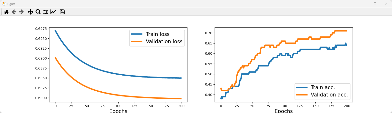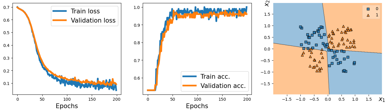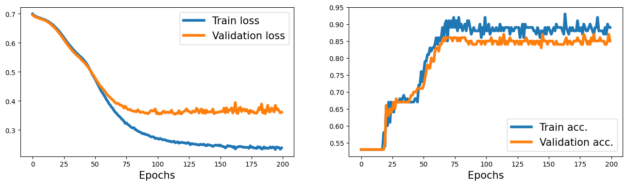 1 2 3 4 5 6 7 8 9 10 11 12 13 14 | fig = plt.figure(figsize=(16, 4)) ax = fig.add_subplot(1, 2, 1) plt.plot(history[0], lw=4) plt.plot(history[1], lw=4) plt.legend(['Train loss', 'Validation loss'], fontsize=15) ax.set_xlabel('Epochs', size=15) ax = fig.add_subplot(1, 2, 2) plt.plot(history[2], lw=4) plt.plot(history[3], lw=4) plt.legend(['Train acc.', 'Validation acc.'], fontsize=15) ax.set_xlabel('Epochs', size=15) plt.show() | cs |