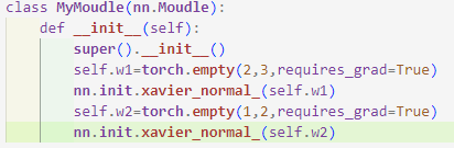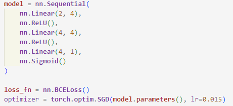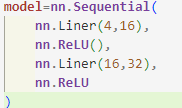 1 2 3 4 5 6 7 8 9 10 11 12 13 14 15 16 17 18 19 | # nn.Moudle 클래스를 상속한 새로운 클래스 만들기 class MyMoudle(nn.Module): # 생성자 메서드 정의 def __init__(self): super().__init__() # 층층 l1=nn.Linear2,4) a1=nn.ReLU() l2=nn.Linear(4,4) a2=nn.ReLU() l3=nn.Linear(4,1) a3=nn.Sigmoid() l=[l1,a1,l2,a2,l3,a3] # 모든 층 nn.ModuleList 객체에 넣음 self.moudle_list=nn.ModuleList(l) # forward() 메서드를 사용하여 정방향 계산 정의 def forward(self,x): for f in self.moudle_list: x=f(x) return x | cs |