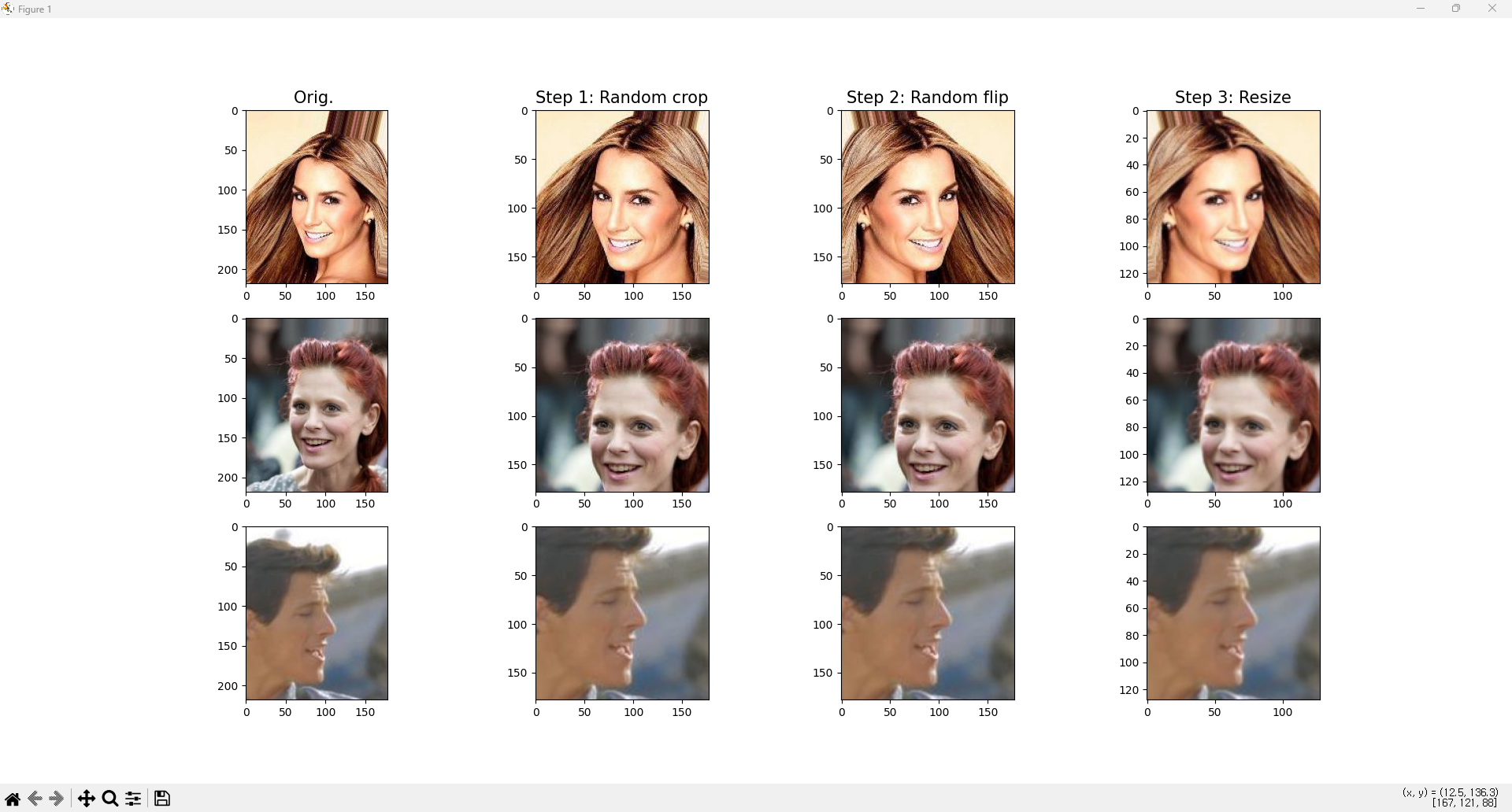 1 2 3 4 5 6 7 8 9 10 11 12 13 14 15 16 17 18 19 20 21 22 23 24 25 26 27 28 29 30 31 32 33 34 35 36 37 38 39 40 41 42 | torch.manual_seed(1) # 랜덤 시드 고정 fig=plt.figure(figsize=(14,12)) # 데이터 셋에서 이미지와 속성 반복 for i,(img,attr) in enumerate((celeba_train_dataset)): # 원본 이미지 출력 ax=fig.add_subplot(3,4,i*4+1) ax.imshow(img) if i==0: ax.set_title('Orig. ',size=15) # 랜덤 크롭(Random Crop) ax=fig.add_subplot(3,4,i*4+2) img_transform=transforms.Compose([ transforms.RandomCrop([178,178]) # 178x178 크기로 랜덤하게 잘라냄 ]) img_cropped=img_transform(img) ax.imshow(img_cropped) if i==0: ax.set_title('Step 1: Random crop',size=15) # 랜덤 수평 반전 ax=fig.add_subplot(3,4,i*4+3) img_transform=transforms.Compose([ transforms.RandomHorizontalFlip() # 50% 확률로 이미지를 좌우반전 ]) img_flip=img_transform(img_cropped) ax.imshow(img_flip) if i==0: ax.set_title('Step 2: Random flip',size=15) # 크기 조정 ax=fig.add_subplot(3,4,i*4+4) img_resized=transforms.functional.resize( img_flip,size=(128,128) # 최종 크기를 128x128로 변환 ) ax.imshow(img_resized) if i==0: ax.set_title('Step 3: Resize',size=15) if i==2: # 3번째 이미지까지만 출력 후 종료 break plt.show() | cs |