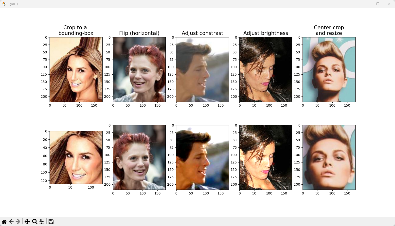 1 2 3 4 5 6 7 8 9 10 11 12 13 14 15 16 17 18 19 20 21 22 23 24 25 26 27 28 29 30 31 32 33 34 35 36 37 38 39 40 41 42 43 44 45 46 47 48 49 50 51 52 53 54 55 56 57 58 59 60 61 62 | fig=plt.figure(figsize=(16,8.5)) # 1열: 바운딩 박스로 자르기 ax=fig.add_subplot(2,5,1) img,attr=celeba_train_dataset[0] ax.set_title('Crop to a \nbounding-box',size=15) ax.imshow(img) # 원본 이미지 ax=fig.add_subplot(2,5,6) # (y, x, height, width)로 자르기 img_cropped=transforms.functional.crop(img,50,20,128,128) ax.imshow(img_cropped) # 잘린 이미지 출력 # 2열: (수평으로) 뒤집기 ax=fig.add_subplot(2,5,2) img,attr=celeba_train_dataset[1] ax.set_title('Flip (horizontal)',size=15) ax.imshow(img) ax=fig.add_subplot(2,5,7) img_flipped=transforms.functional.hflip(img) # 수평 뒤집기 ax.imshow(img_flipped) # 3열: 대비 조정 ax=fig.add_subplot(2,5,3) img,attr=celeba_train_dataset[2] ax.set_title('Adjust constrast',size=15) ax.imshow(img) ax=fig.add_subplot(2,5,8) # 대비 2배 증가 img_adj_contrast=transforms.functional.adjust_contrast( img,contrast_factor=2 ) ax.imshow(img_adj_contrast) # 4열: 명도 조정 ax=fig.add_subplot(2,5,4) img,attr=celeba_train_dataset[3] ax.set_title('Adjust brightness',size=15) ax.imshow(img) ax=fig.add_subplot(2,5,9) # 명도 1.3배 증가 img_adj_brightness=transforms.functional.adjust_brightness( img,brightness_factor=1.3 ) ax.imshow(img_adj_brightness) # 5열: 이미지 중앙 자르기 center ax=fig.add_subplot(2,5,5) img,attr=celeba_train_dataset[4] ax.set_title('Center crop\nand resize',size=15) ax.imshow(img) ax=fig.add_subplot(2,5,10) # 이미지 중앙에서 70% 크기로 자르기 img_center_crop=transforms.functional.center_crop( img,[0.7*218,0.7*178] ) # 원본 크기로 다시 리사이징 img_resized=transforms.functional.resize( img_center_crop,size=(218,178) ) ax.imshow(img_resized) plt.show() | cs |