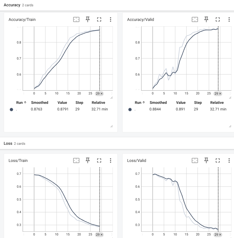 12) 621페이지 예제에서 손실(훈련,검증)과 정확도(훈련,검증)를 텐서보드를 이용하여 그래프로 그려보라.