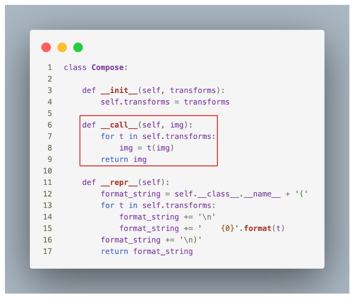 Compose 클래스 내부의 __call__ 메소드 때문에 객체를 함수처럼 호출할 수 있다.