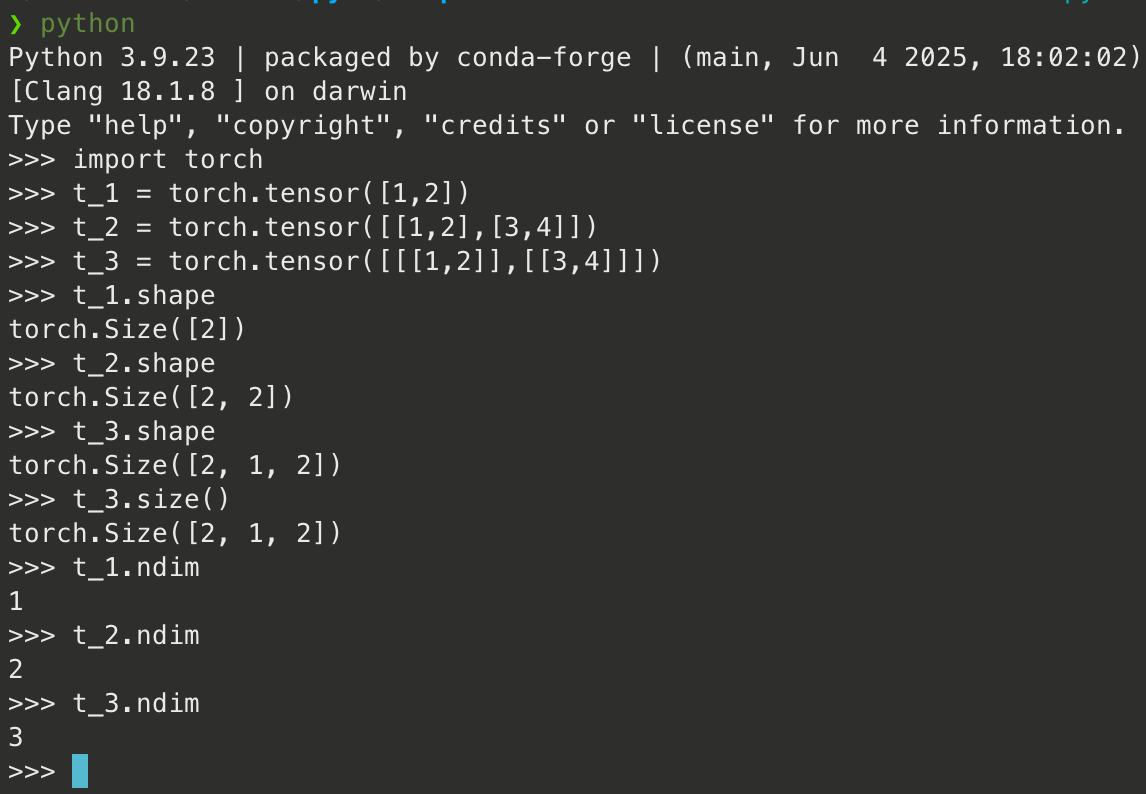 파이토치에서 텐서의 차원을 확인하려면 .shape, .ndim, .size() 를 사용할 수 있다.