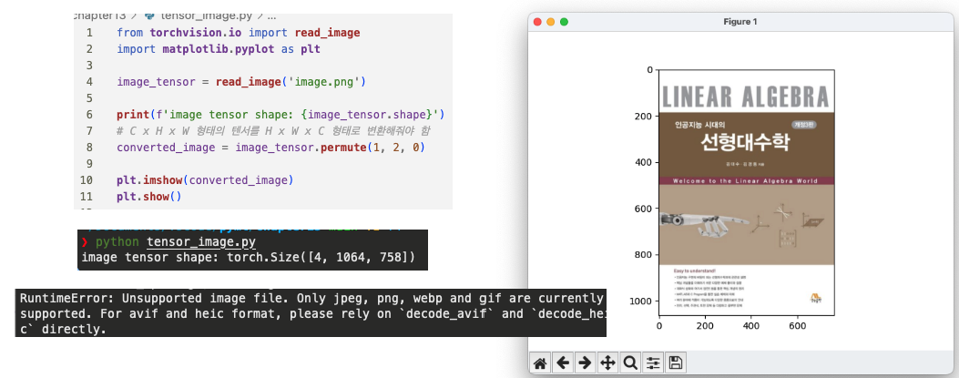 torchvision 라이브러리의 io.read_image 메서드를 이용해 영상을 읽어 텐서로 변환할 수 있다. (jpeg, png, webp, gif 유형의 파일만 가능)