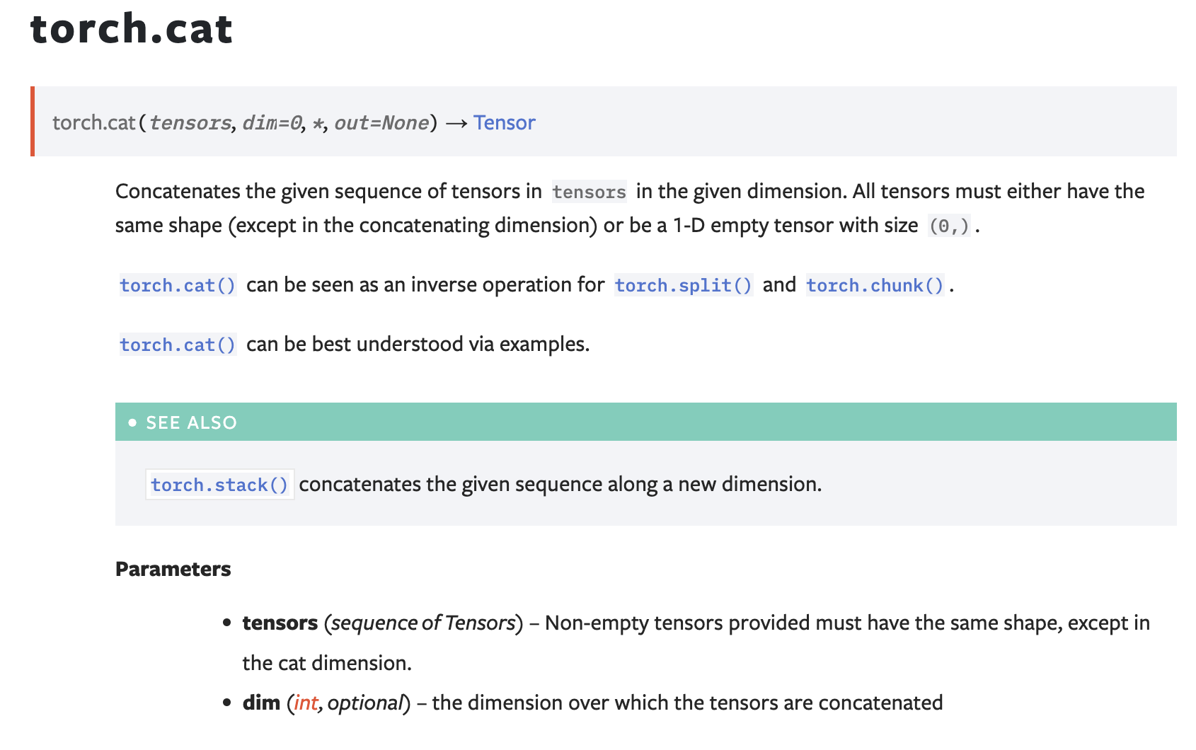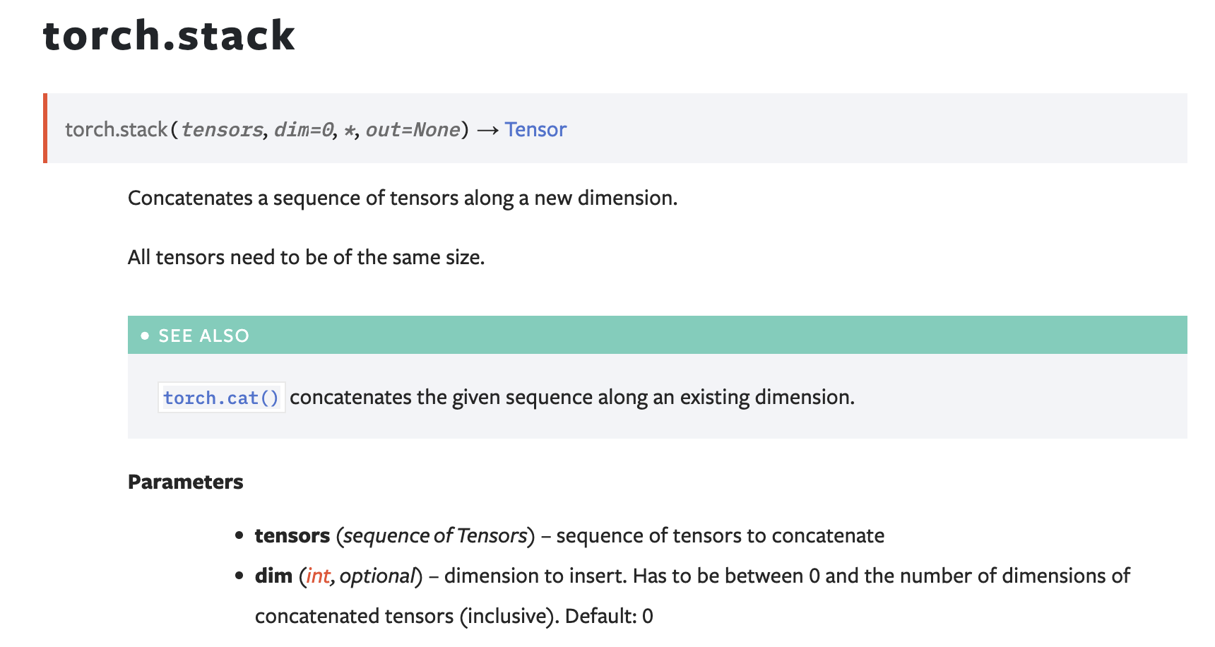 cat()에서는 텐서들이 이어붙을 차원을 나타내고, stack()에서는 새로운 차원이 생성될 위치를 나타낸다.