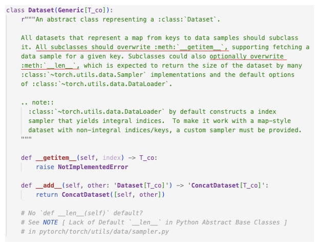 이 클래스를 상속하여 사용자 정의 데이터셋을 만들 수 있으며, 이는 데이터 로딩 및 전처리 파이프라인의 기초가 된다.