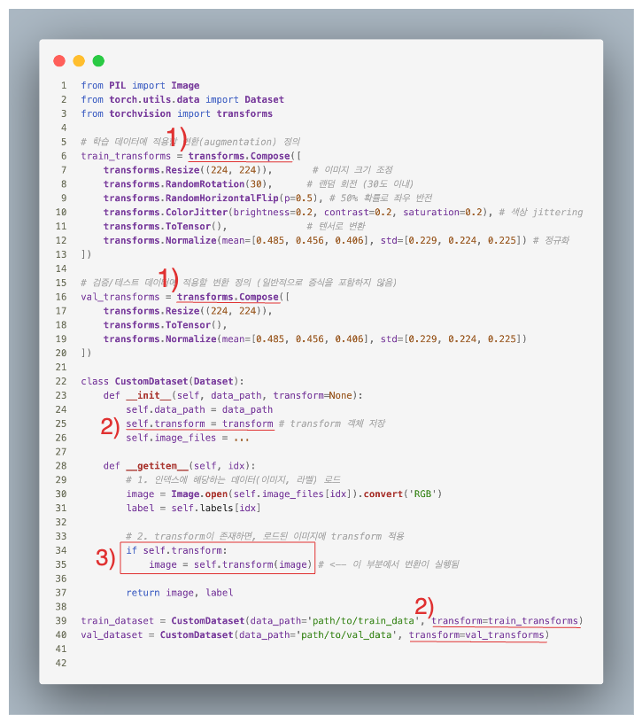 3) Dataset 클래스의 __getitem__ 메서드에서 이미지를 로드한 후 정의된 변환을 적용한다.