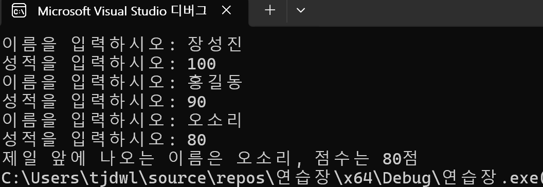 // 2) 이름, 점수를 멤버로 가지는 구조체를 정의하고 이름이 제일 앞인 학생의 정보를 출력.