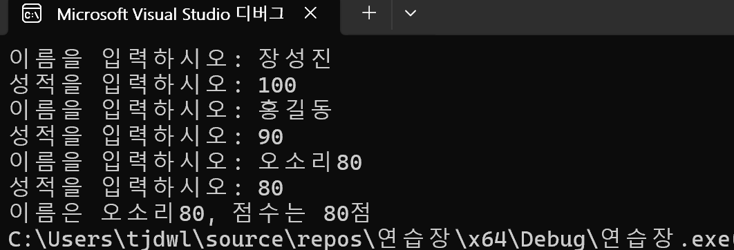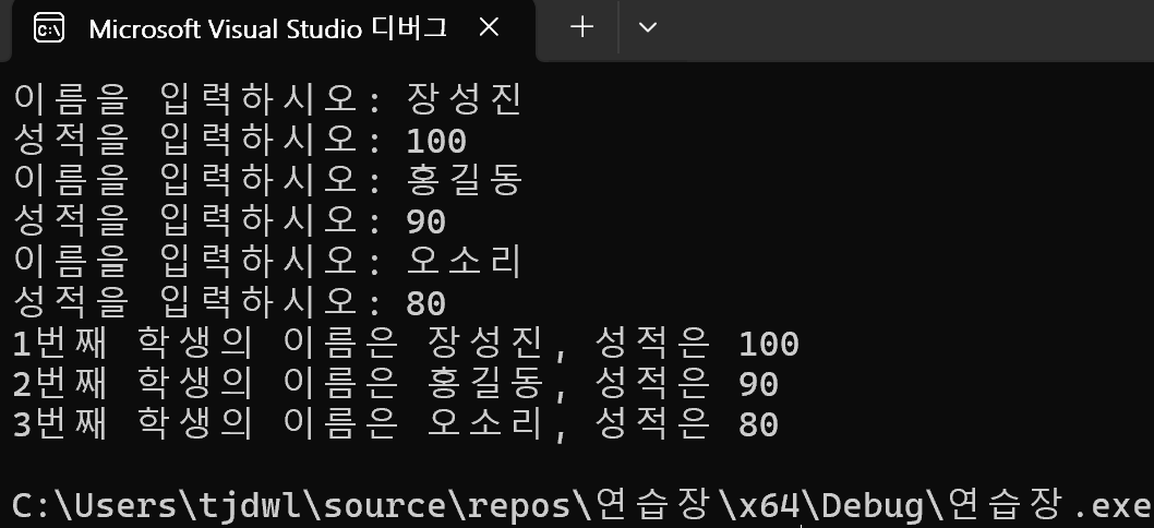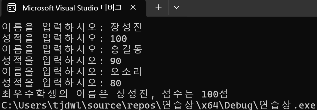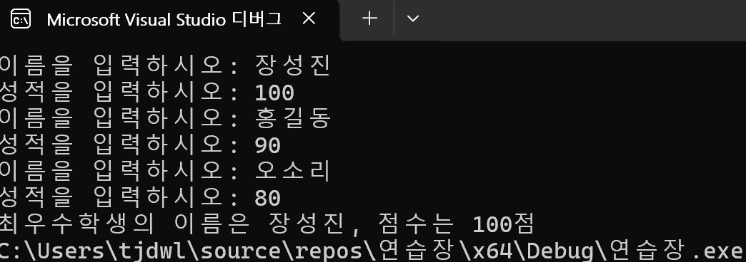 printf("최우수학생의 이름은 %s, 점수는 %d점", stu[greatest].name, stu[greatest].score);