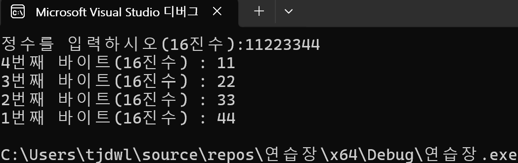 printf("%d번째 바이트(16진수) : %x\n", i + 1, x.mem1[i]);