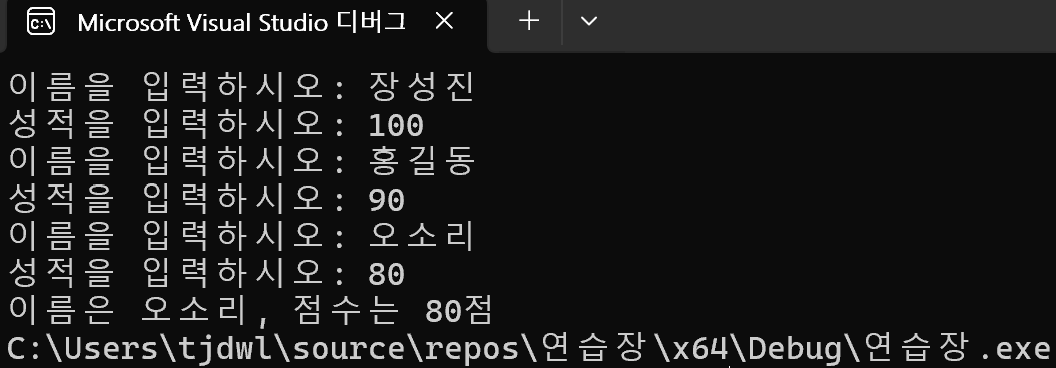 printf("이름은 %s, 점수는 %d점", stu[first].name, stu[first].score);