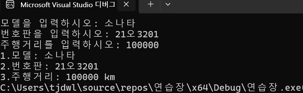 // 5) 자동차 모델, 번호판, 주행거리를 멤버로 가지는 구조체를 선언하여 입력 및 출력하는 프로그램을 작성하라.
