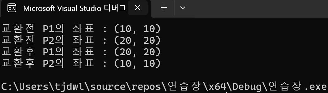 printf("교환후 P1의 좌표 : (%d, %d)\n", p1.x, p1.y);