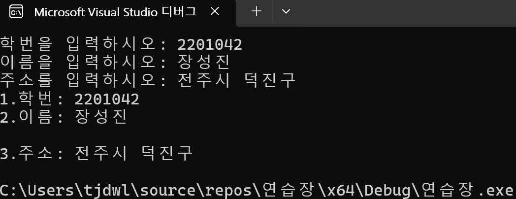 // 4) 이름, 학번, 주소를 멤버로 가지는 구조체를 선언하여 입력 및 출력하는 프로그램을 작성하라.