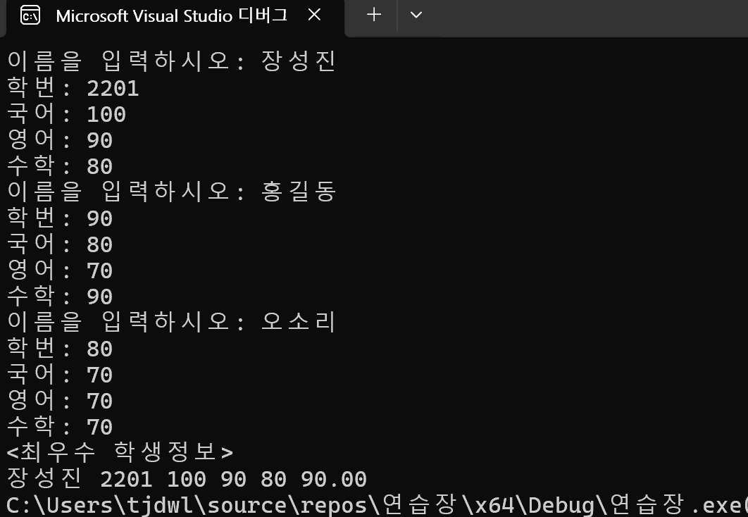 // 4) 성적을 저장하는 구조체를 정의하여 최우수 학생을 출력하는 프로그램을 작성하시오.