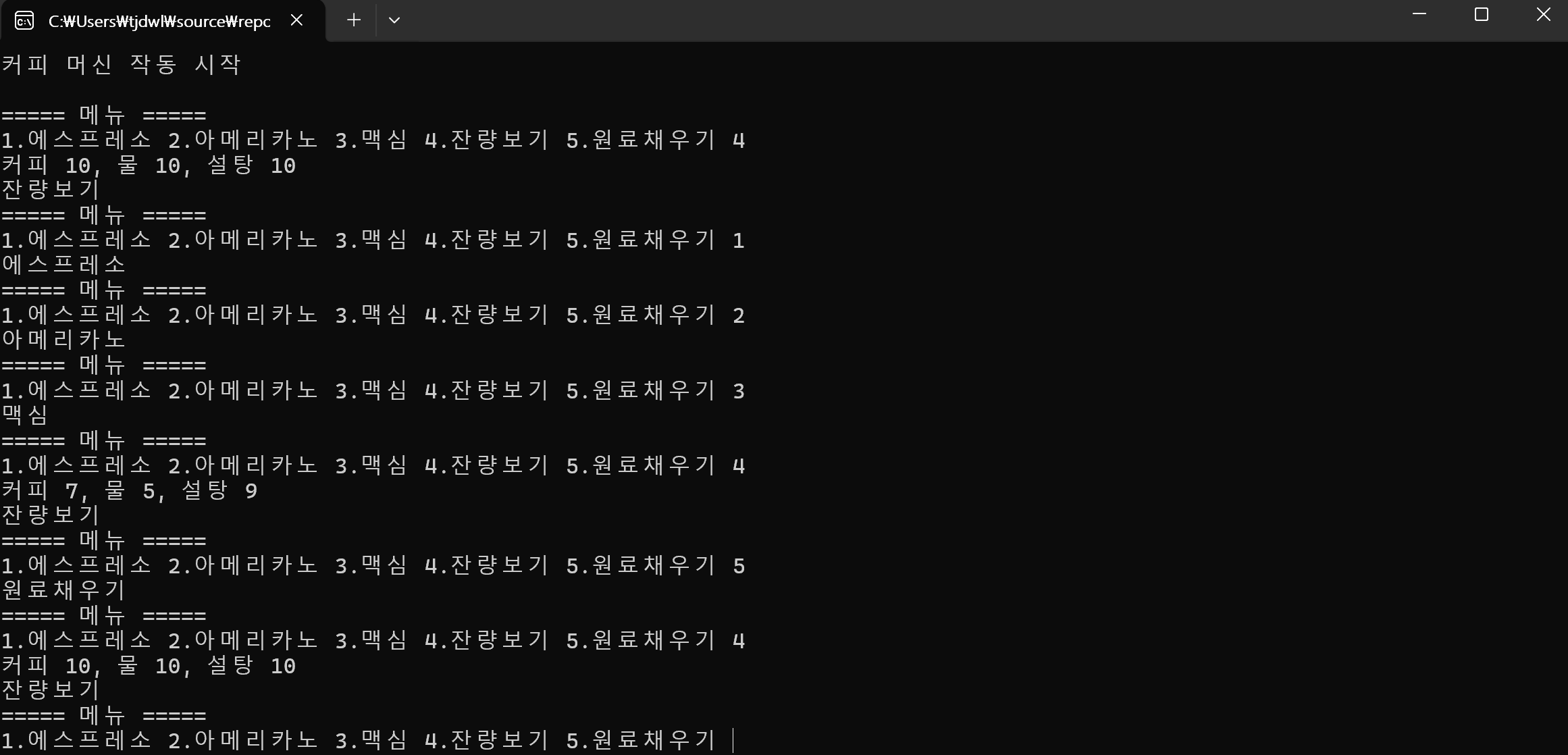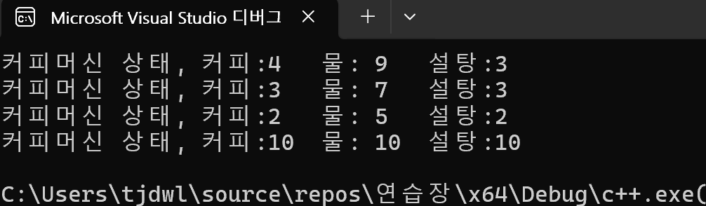 << "\t물: " << wat << "\t설탕:" << sug << endl;