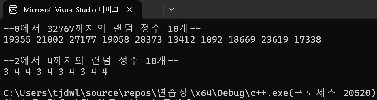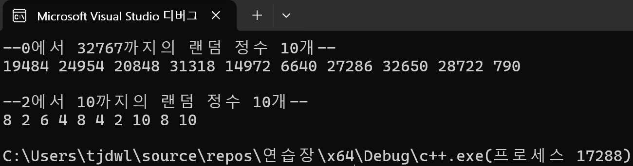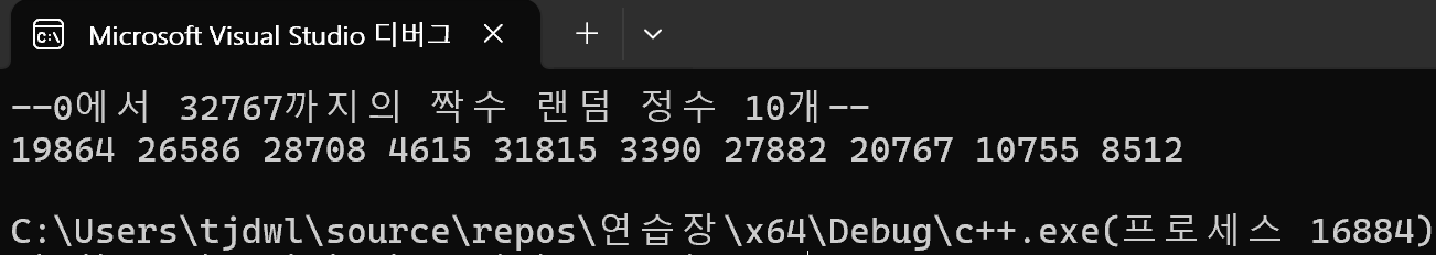 cout << "--0에서 " << RAND_MAX << "까지의 랜덤 정수 10개--\n";