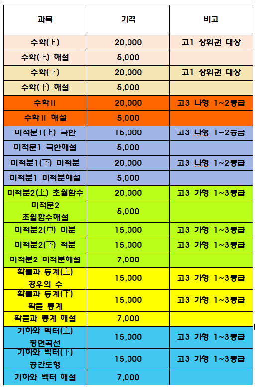 확통(상)-경우의 수, 확통(하)-확률통계, 기벡(상)-평면곡선, 기벡(하)-공간도형