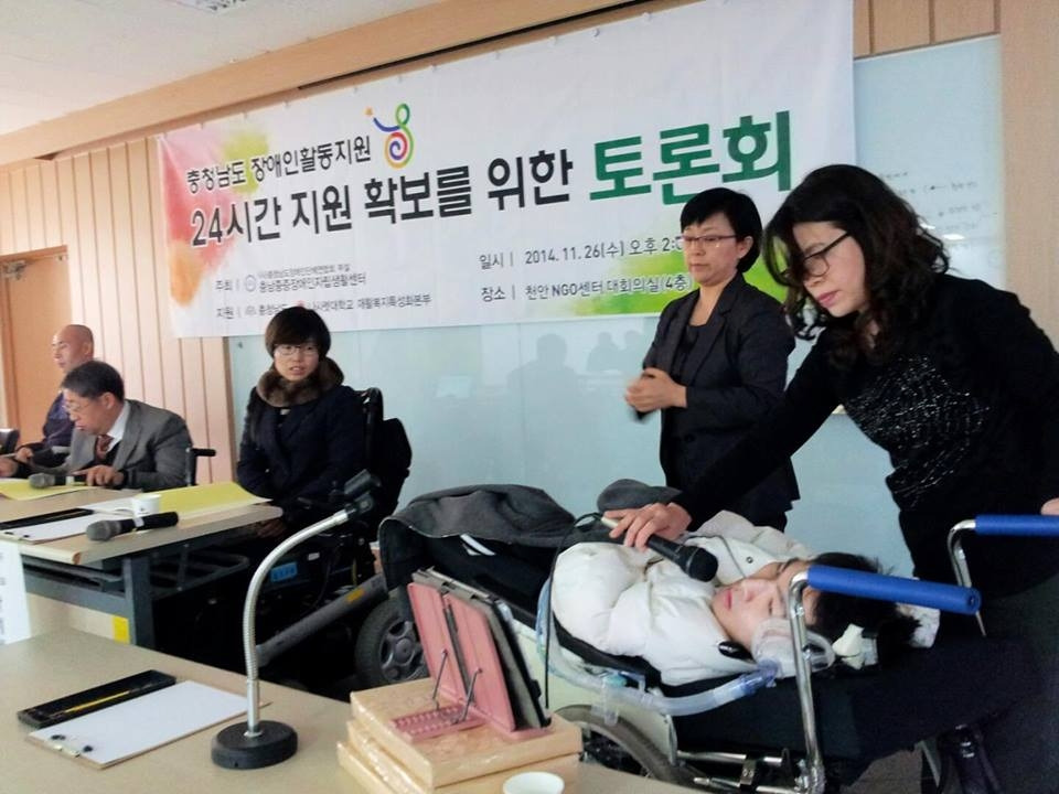 Jang Ik-seon, then serving as president of the Gwangju Muscular Dystrophy Association, delivers a speech at the 2014 South Chungcheong Province Forum on Securing 24-Hour Support for People with Disabilities, urging policy reforms for continuous care. (Courtesy of Jang Ik-seon)