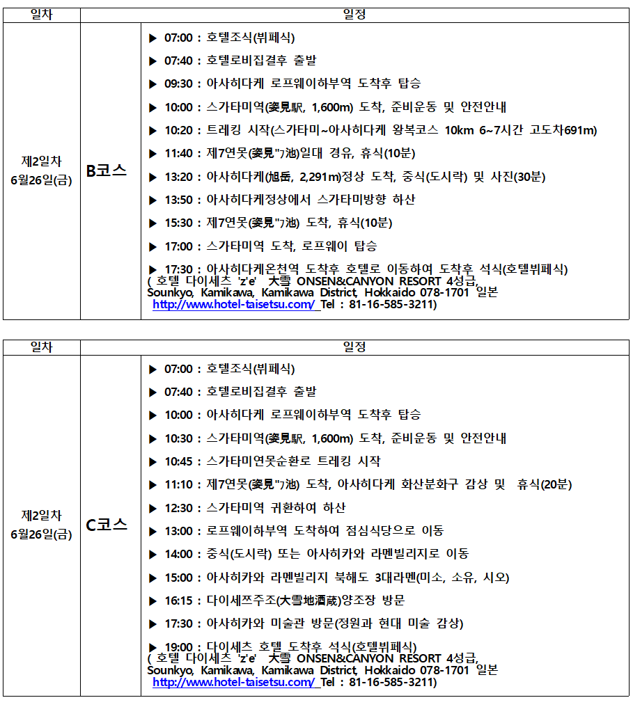 - 2일차 아사히다케旭岳(Asahidake 2,291m) 등정 및 트레킹 (A,B,C 코스)