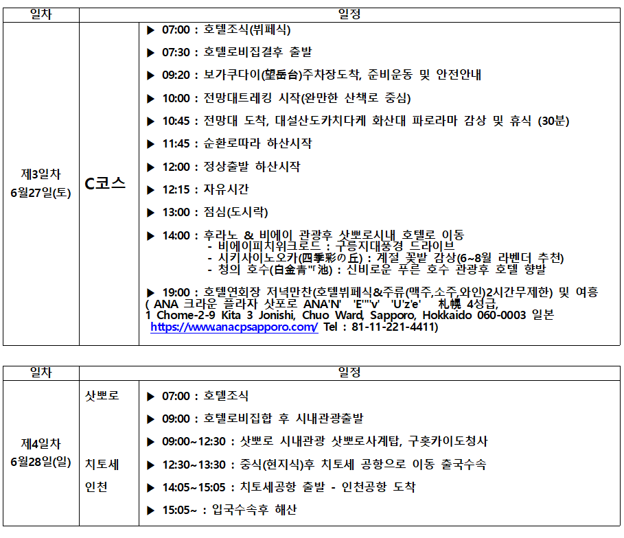 (4) 제4일차 6월 28일(일) : 삿포로 시내관광 → 치토세 공항 - 인천공항