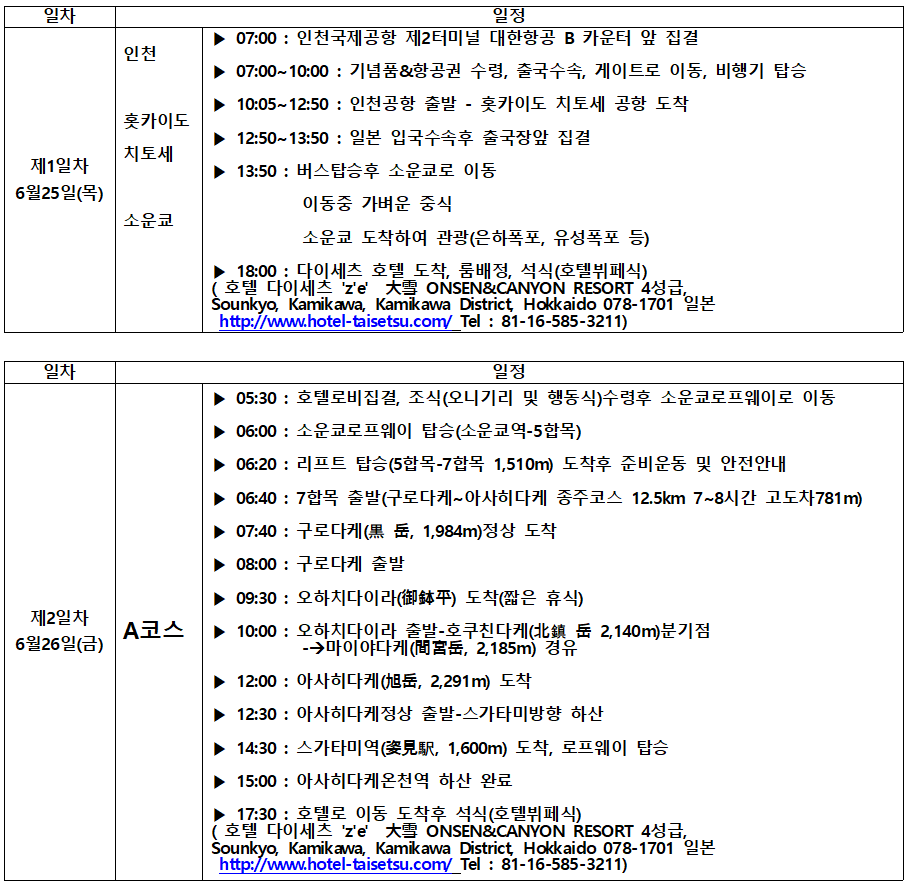 (1) 제1일차 6월 25일(목) : 인천공항 → 북해도 치토세공항 → 소운쿄 → 호텔