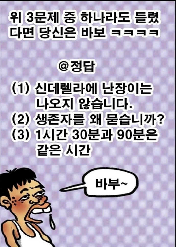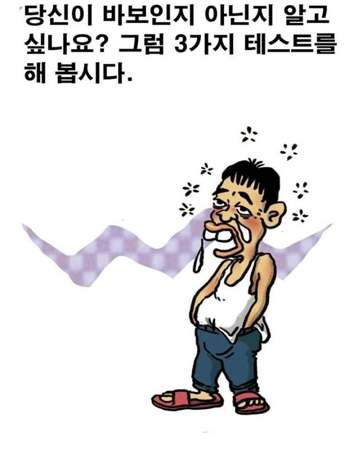 바보 테스트 ...? 작성자아이리|작성시간21.05.21|조회수285 목록 댓글 2 글자크기 작게가 글자크기 크게가 다음검색 현재 게시글 추가 기능 열기 북마크 공유하기 신고 센터로 신고 댓글 댓글 2 댓글쓰기 답글쓰기 댓글 리스트 작성자진이 | 작성시간 21.05.27 최소한 바보는 아니네요.ㅎ 작성자별빛 | 작성시간 21.07.07 아직은 바보 아닙니다 ㅋ 댓글 전체보기
