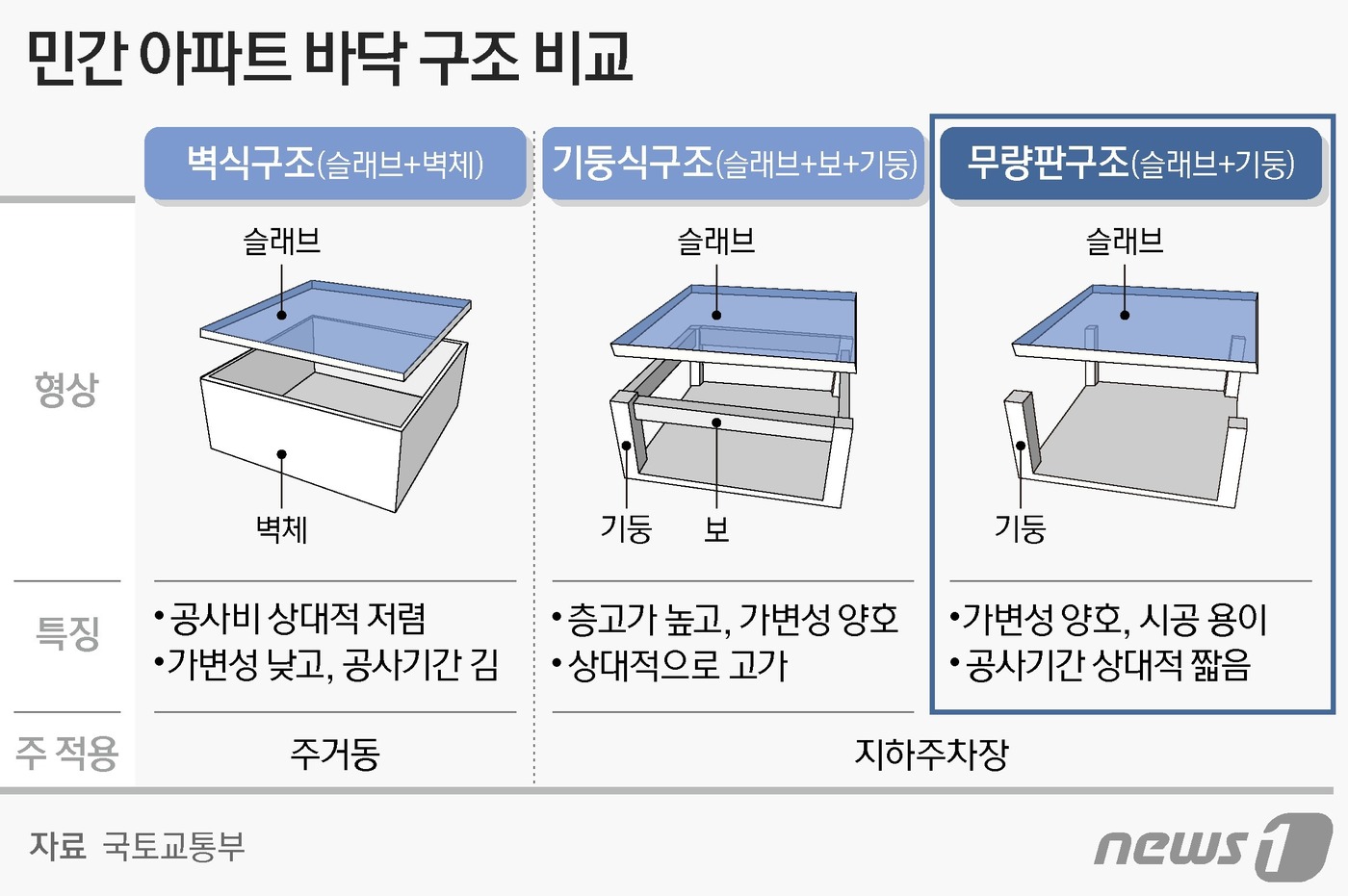 무량판 구조는 대들보 자재 두께만큼의 높이를 시공하지 않아도 되기 때문에 층고가 높고 내력벽이 없어 공간 효율성이 높은 장점 때문에 2017년부터 아파트 공사 등에 본격적으로 도입됐다고 합니다