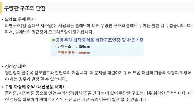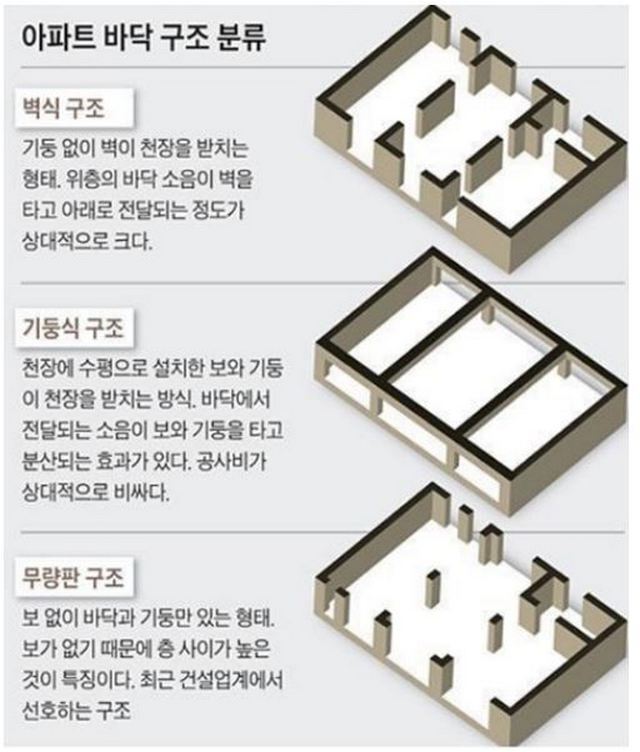 | 소음이 벽타고 전달 층간소음 취약한편 | 공사비가 상대적로 많이 듬 | 바닥이 두꺼운편 |
