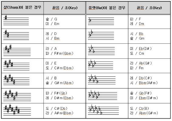 또한 모든 곡의 끝 음이 그 곡의 조(Key) 이름이 됩니다. 즉, 샾(#)이 하나 붙은경우, 곡의 끝음이 솔(G)로 끝났다면 'G Major', 미(E)로 끝났다면 'E minor'가 되는 것입니다.