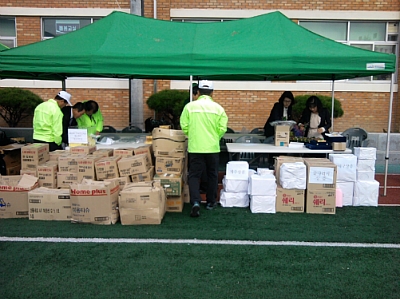 웃옷부터 벗고, 탁자를 걸레로 닦고, 현수막을 달고, 물품을 배치하고... 휴~