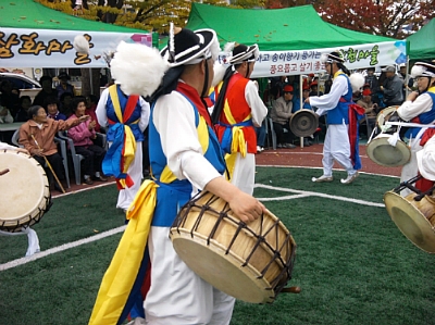 동네부스들을 돌며 흥을 돋워주고 있는 풍물패 단원들