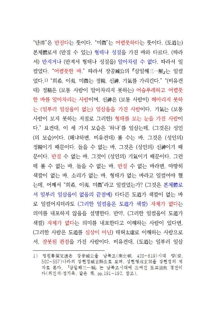 첫 번째 문단은 설명한다. “(어렴풋한 본체體인 도道는) ‘하나’이면서 ‘하나’가 아닌데, ‘하나’가 흩어져 ‘셋’을 이루기 때문이다.”