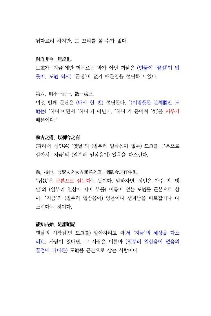 여섯 번째 문단은 (다시 한 번) 설명한다. “(어렴풋한 본체體인 도道는) ‘하나’이면서 ‘하나’가 아닌데, ‘하나’가 흩어져 ‘셋’을 이루기 때문이다.”