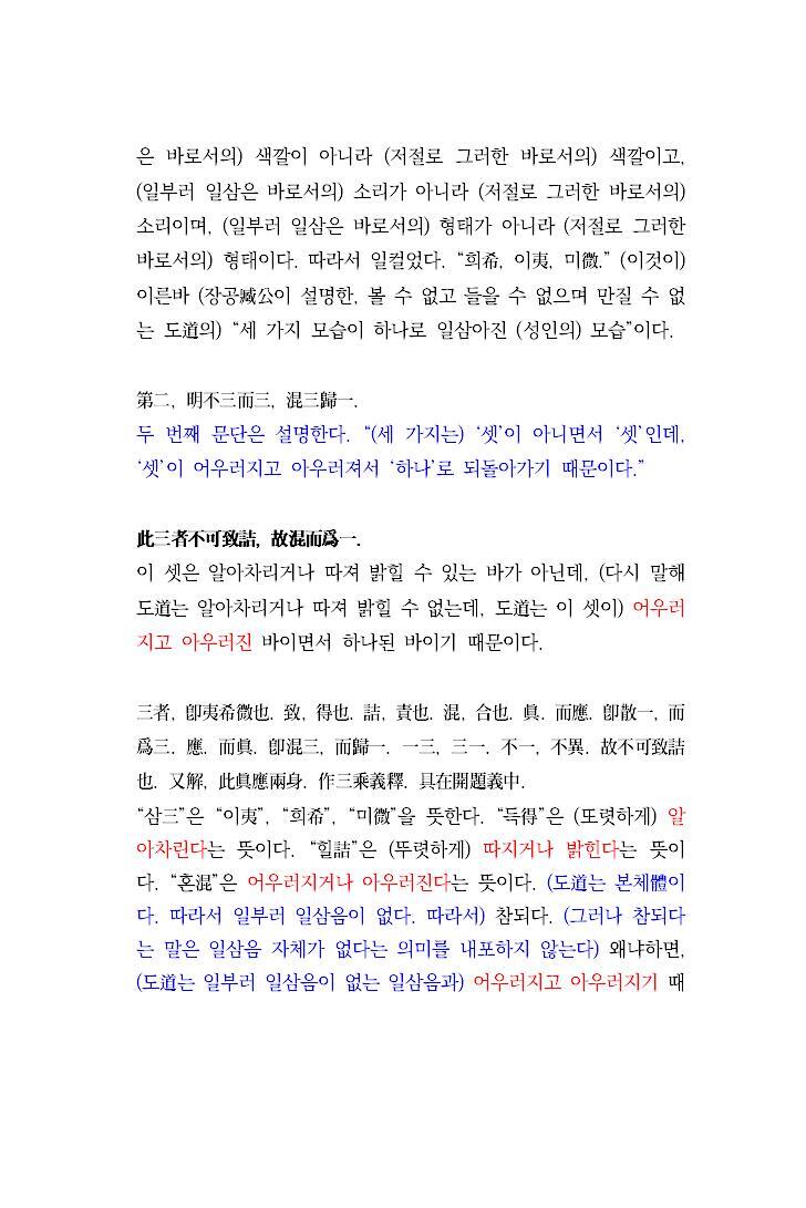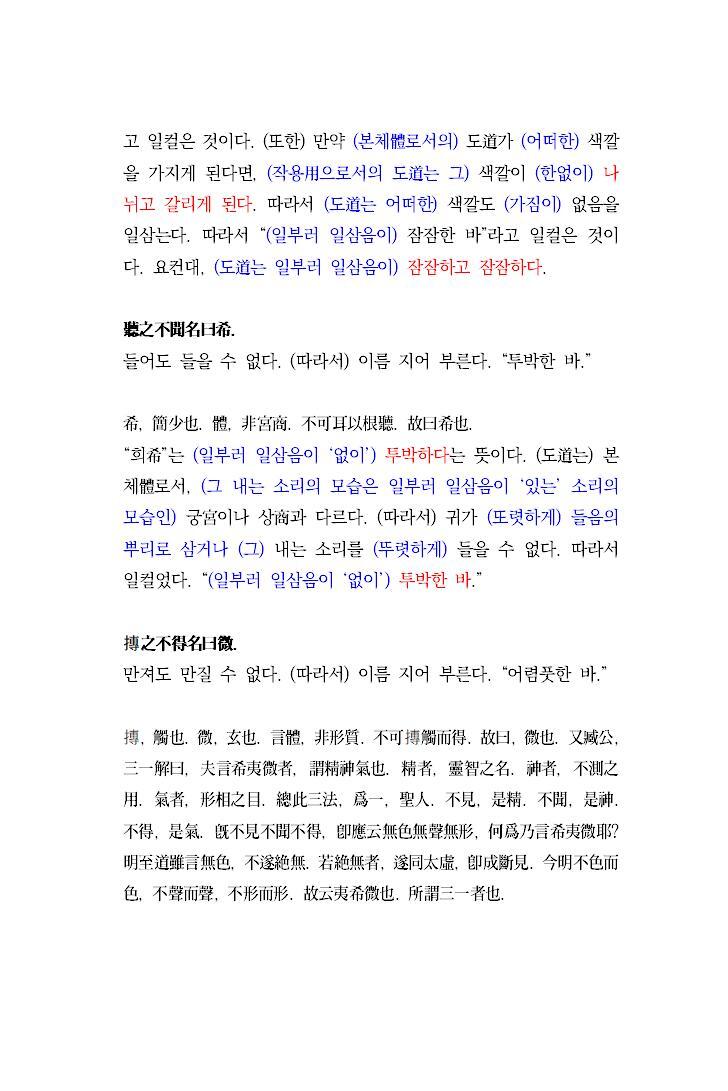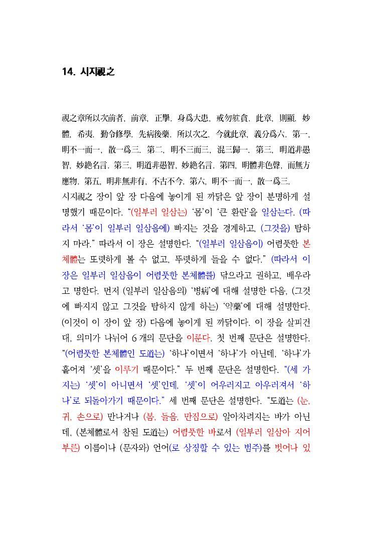 시지視之 장이 앞 장 다음에 놓이게 된 까닭은 앞 장이 분명하게 설명했기 때문이다. “(일부러 일삼는) ‘몸’이 ‘큰 환란’을 일삼는다. (따라서 ‘몸’이 일부러 일삼음에) 빠지는 것을 경계하고, (그것을) 탐하지 마라.” 따라서 이 장은 설명한다. “(일부러 일삼음이) 어렴풋한 본체體는 또렷하게 볼 수 없고, 뚜렷하게 들을 수 없다.” (따라서 이 장은 일부러 일삼음이 어렴풋한 본체體를) 닦으라고 권하고, 배우라고 명한다. 먼저 (일부러 일삼음의) ‘병病’에 대해 설명한 다음, (그것에 빠지지 않고 그것을 탐하지 않게 하는) ‘약藥’에 대해 설명한다. (이것이 이 장이 앞 장) 다음에 놓이게 된 까닭이다. 이 장을 살피건대, 의미가 나뉘어 6개의 문단을 이룬다. 첫 번째 문단은 설명한다. “(어렴풋한 본체體인 도道는) ‘하나’이면서 ‘하나’가 아닌데, ‘하나’가 흩어져 ‘셋’을 이루기 때문이다.” 두 번째 문단은 설명한다. “(세 가지는) ‘셋’이 아니면서 ‘셋’인데, ‘셋’이 어우러지고 아우러져서 ‘하나’로 되돌아가기 때문이다.” 세 번째 문단은 설명한다. “도道는 (눈, 귀, 손으로) 만나거나 (봄, 들음, 만짐으로) 알아차려지는 바가 아닌데, (본체體로서 참된 도道는) 어렴풋한 바로서 (일부러 일삼아 지어 부른) 이름이나 (문자와) 언어(로 상징할 수 있는 범주)를 벗어나 있기 때문이다.” 네 번째 문단은 설명한다. “(도道는) 본체體로서 (일부러 일삼은) 색깔과 소리와 다르다. (일부러 일삼은) 모습이 없이 만물과 어우러지고 아우러지는 바이기 때문이다.” 다섯 번째 문단은 설명한다. “(도道는 일삼음 자체가) 없는 바도 아니며, (일부러 일삼음이) 있는 바도 아닌데, (따라서 만물이 ‘옛날’에만 머무는 바도 아니며, ‘지금’에만 머무는 바도 아니듯이, 도道 역시) ‘옛날’에만 머무는 바도 아니며, ‘지금’에만 머무는 바도 아니다.” 여섯 번째 문단은 (다시 한 번) 설명한다. “(어렴풋한 본체體인 도道는) ‘하나’이면서 ‘하나’가 아닌데, ‘하나’가 흩어져 ‘셋’을 이루기 때문이다.”