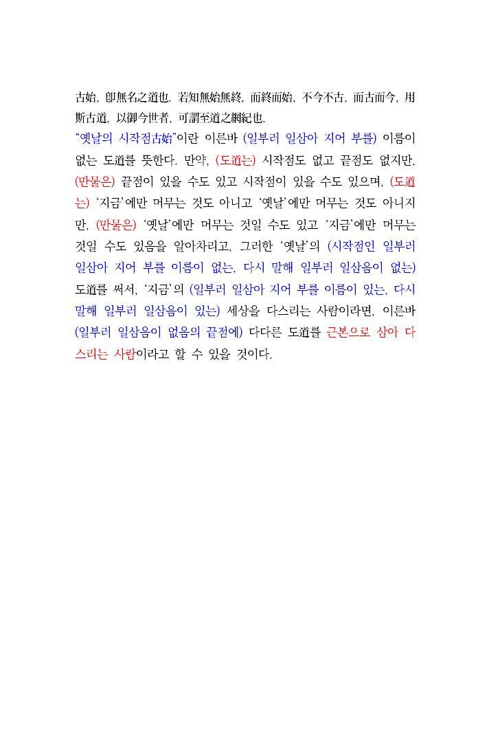 “옛날의 시작점古始”이란 이른바 (일부러 일삼아 지어 부를) 이름이 없는 도道를 뜻한다. 만약, (도道는) 시작점도 없고 끝점도 없지만, (만물은) 끝점이 있을 수도 있고 시작점이 있을 수도 있으며, (도道는) ‘지금’에만 머무는 것도 아니고 ‘옛날’에만 머무는 것도 아니지만, (만물은) ‘옛날’에만 머무는 것일 수도 있고 ‘지금’에만 머무는 것일 수도 있음을 알아차리고, 그러한 ‘옛날’의 (시작점인 일부러 일삼아 지어 부를 이름이 없는, 다시 말해 일부러 일삼음이 없는) 도道를 써서, ‘지금’의 (일부러 일삼아 지어 부를 이름이 있는, 다시 말해 일부러 일삼음이 있는) 세상을 다스리는 사람이라면, 이른바 (일부러 일삼음이 없음의 끝점에) 다다른 도道를 근본으로 삼아 다스리는 사람이라고 할 수 있을 것이다.